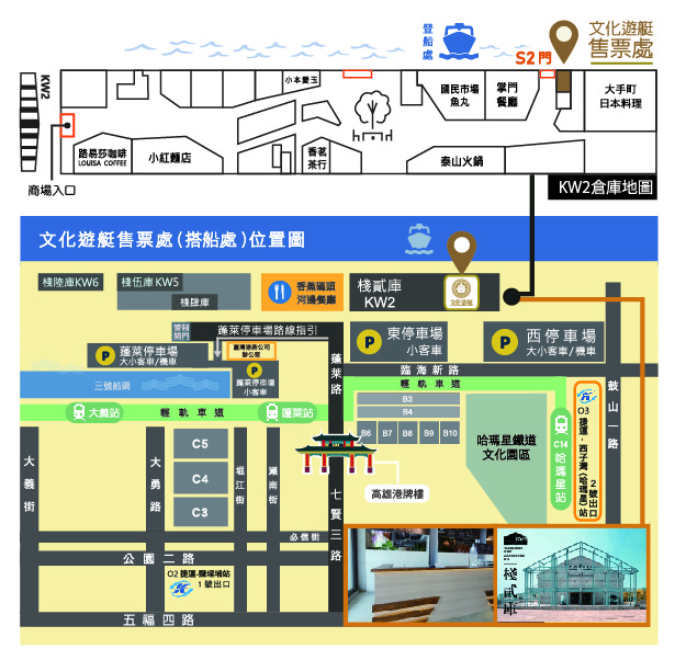 棧貳庫售票處:高雄市鼓山區蓬萊路17號 (七賢三路底過高雄港牌樓)
